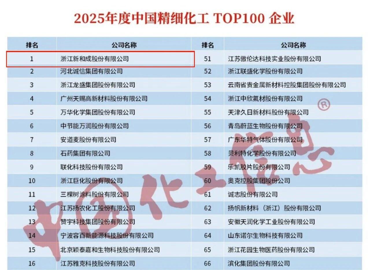 新和成同时荣膺“2025年度中国精细化工TOP100企业”“2025年度中国精细化工创新发展TOP10企业”榜首。此次登顶,既是对新和成综合实力的高度认可,也彰显了新和成在经营管理、创新和绿色发展等方面的硬核实力。